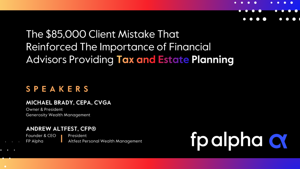 In this live FA Magazine webinar, veteran advisor Mike Brady and FP Alpha founder Andrew Altfest walk through real client scenarios where tax and estate planning had a material impact on changing the position of the Financial Advisor as a reactive afterthought to a trusted partner for their clients.